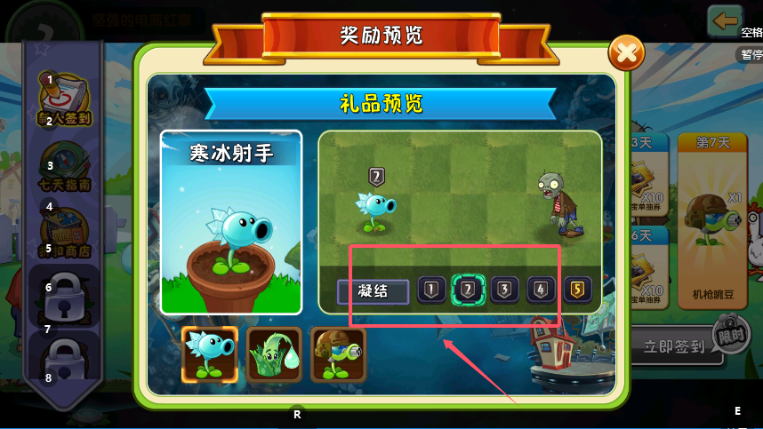 4、从活动开始日起,每日登录游戏并进入该页面点击签到,即可逐日解锁对应奖励。连续签到达到第7天时,便能获得“机枪豌豆”等稀有植物,这些植物在实战中能发挥重要作用。