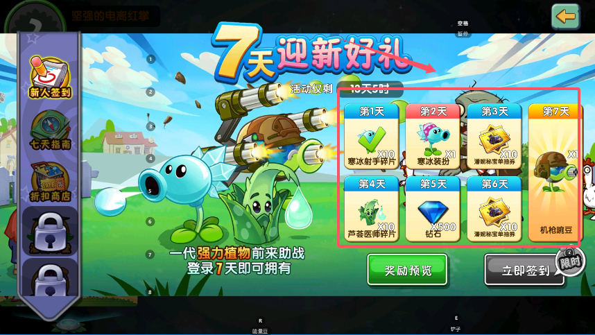 4、查看完奖励内容后,只需点击对应日期的“立即签到”按钮,即可完成当日签到并领取奖励。坚持签到满7天后,便能解锁“机枪豌豆”等特殊植物,为后续的游戏进程提供帮助。
