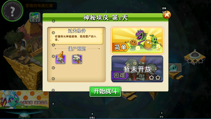 2、选择具体关卡后,界面顶部会明确显示关卡名称与通关目标要求。右侧难度区域中,除默认开放的“简单”模式外,“困难”模式初期处于锁定状态,需逐步解锁。