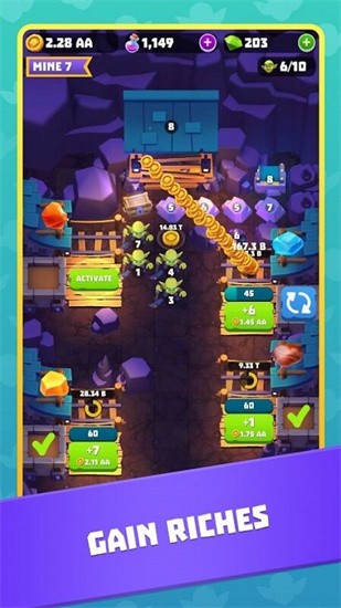 2、建立自驱式的成长循环,采集黄金用于升级工具与解锁新地精,更强队伍又能开拓更深矿层获取珍稀资源。正向反馈明确,持续提供达成目标的满足感。