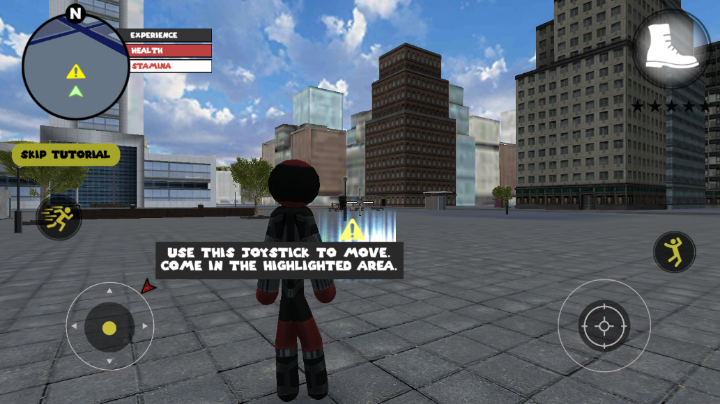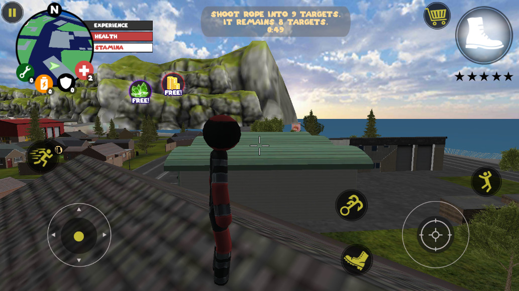 左侧移动、加速,右侧绳索,攻击(跳跃),跳跃,右上侧的武器更换以及血量、经验的显示都实时更新,一览无遗,凭借着大家自由的玩法,与其他帮派的人物进行交火,期间杀人能够获得经验,杀多了会产生星级,警察和其他附近角色会特殊照顾你对你展开火热的进攻,而如何存活,如何将其他人物击杀则是你所需要完成的任务。