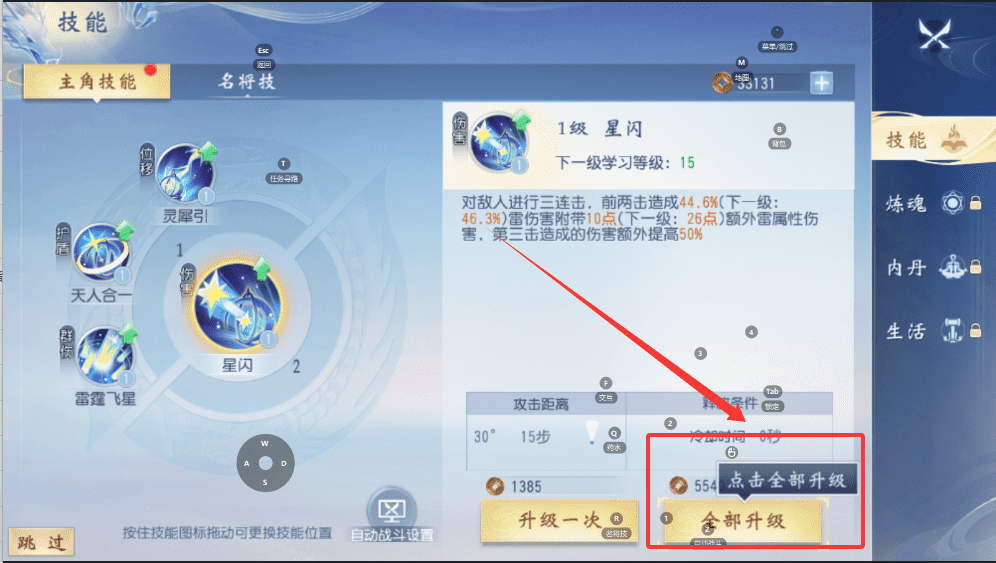 1、比如看到“星闪”技能,点击“升级一次”或“全部升级”就能增强伤害,记得留意下一级的学习等级要求哦。