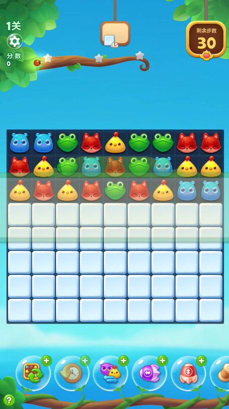 注意,如果动物消除后上方的动物坠落,形成横排或竖排有三个相同的动物,系统会再次自动消除而无需我们操作。