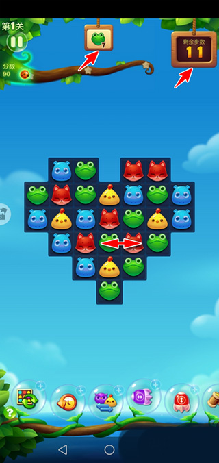 3.接下来,由于消除了 3 个青蛙,上方的任务牌就变成 7 了;同时由于用掉了 1 步,可用步数也变成 11 了。