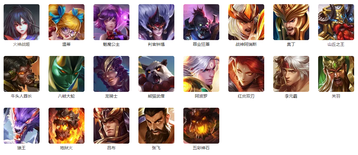 参与活动,兑换玄穹天帝-神宵、战斗女神-文杏、关羽-渊相、狄仁杰-棠华、李元霸-竹扬、圣枪使-长歌、石甲守护者-琼枝、火舞歌灵-芳爻等皮肤。
