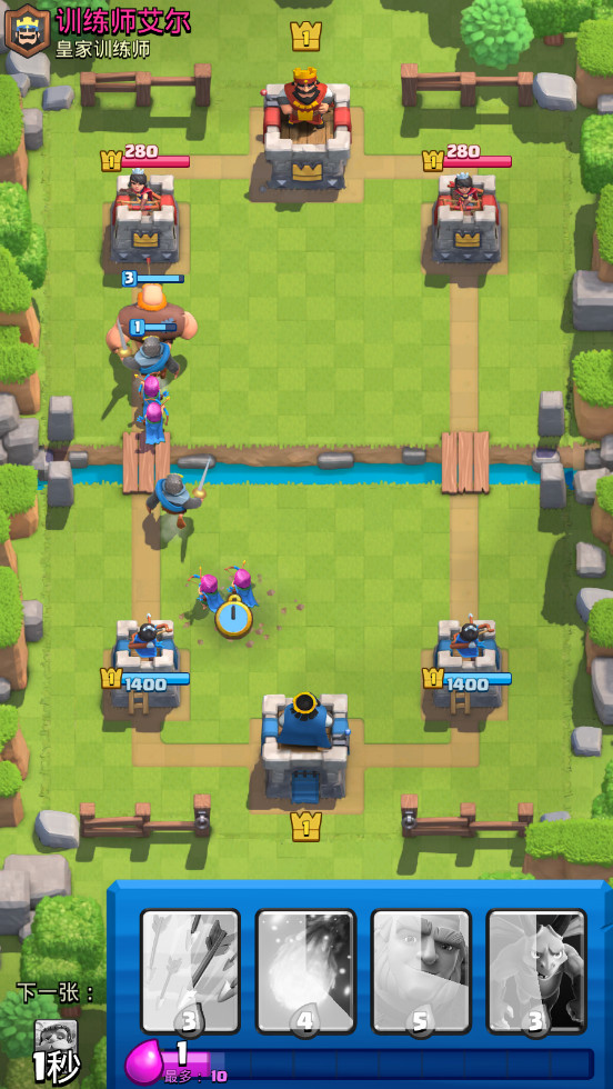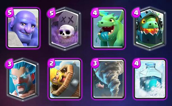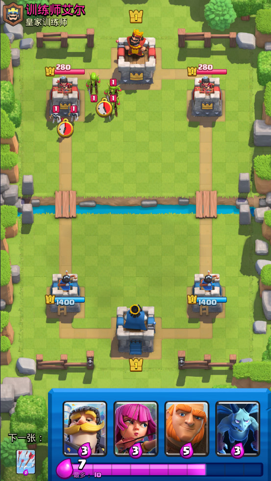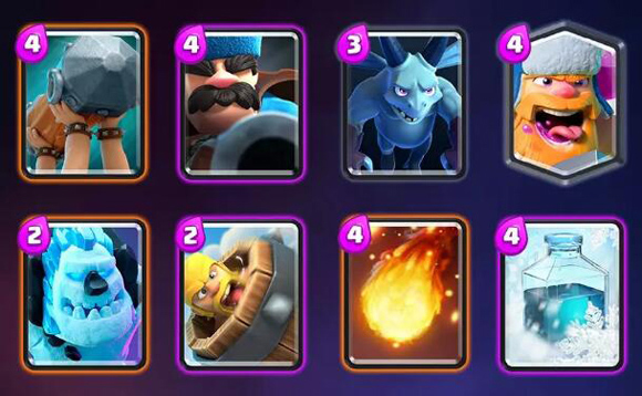 这套卡组看似以攻城槌和三枪作为核心,实际上却贯彻着平推流的奥义。在常规时间更多是和对手拼消耗,不用过于冒进。进入双倍圣水时间后,则依靠着不断地累积兵力和圣水优势来给予对手压力,最终形成平推之势。无论是三枪分路配合攻城锤,还是飞行器解场后配合野蛮人的推进,慢工出细活,是对这套卡组的最好诠释。