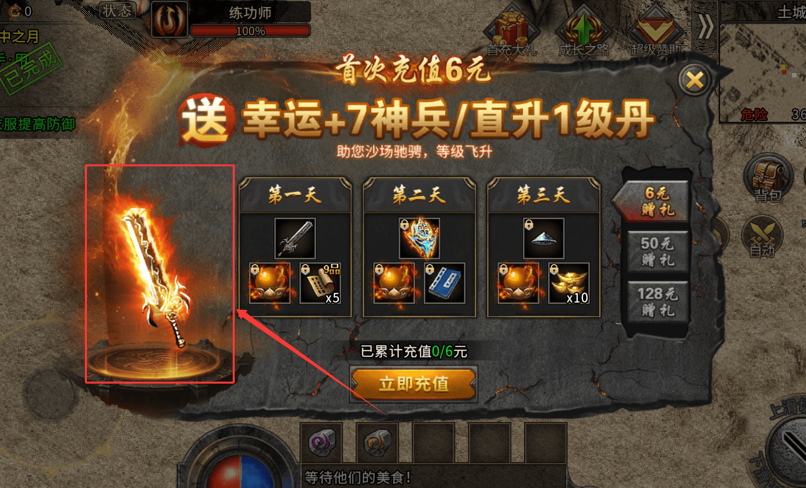 1、首充助力快速起步,你可以先完成6元首充,领取幸运+7神兵和直升丹,这样能直接提升战力。