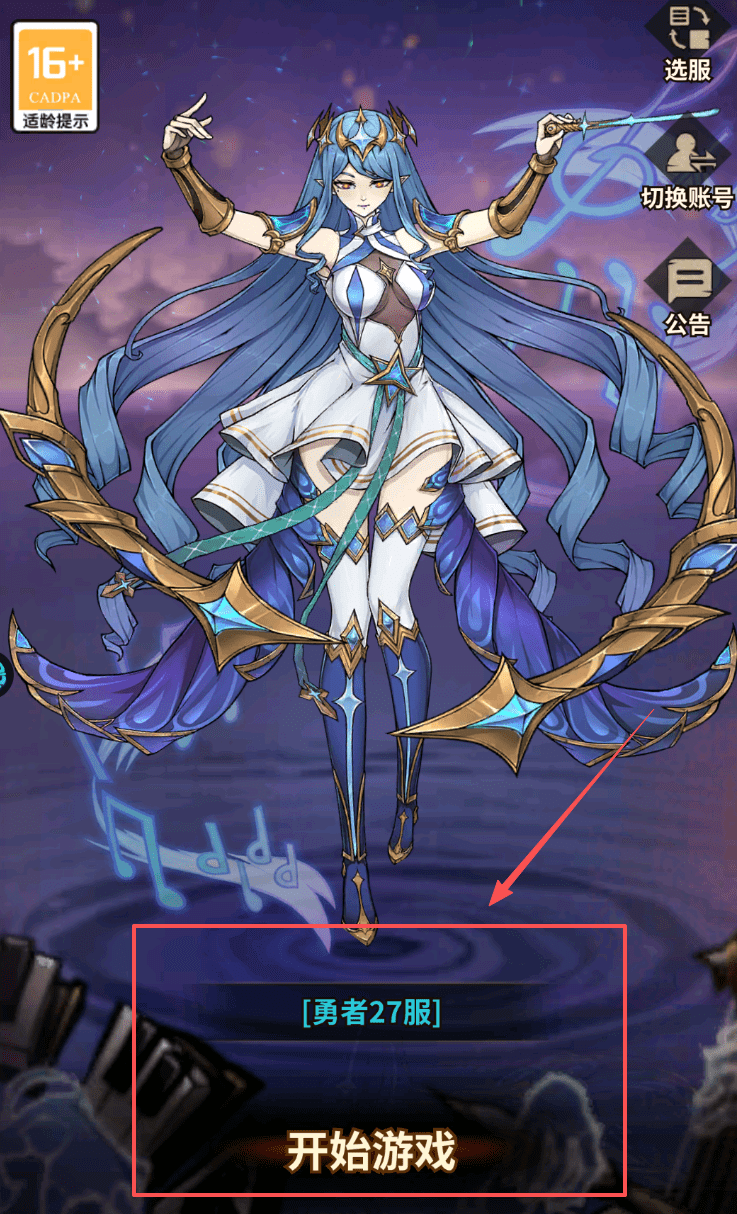 1、首先哦,你会在初始界面看到适龄提示、公告和选服等入口。