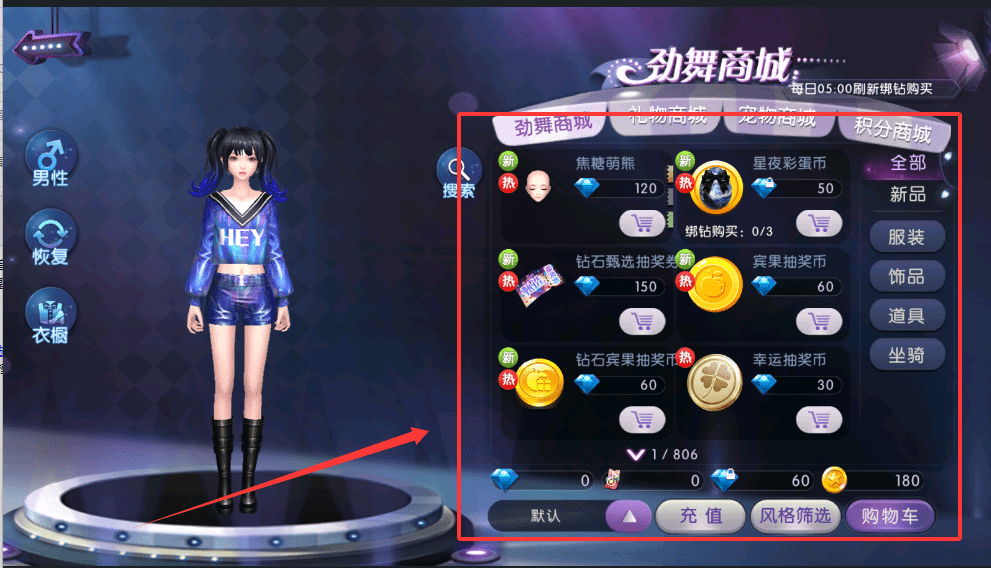 3、通过“搜索”或“风格筛选”找到想要的服装,饰品或坐骑,留意“钻石甄选抽奖”和“积分商城”板块,每日“00刷新”后可能会有新货上架,选好后加入“购物车”统一购买就好。