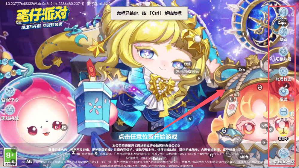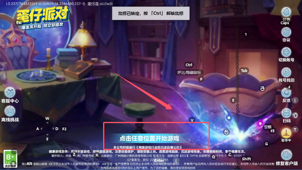 1、运行蛋仔派对游戏后,首先映入眼帘的是登录主界面,色彩丰富造型可爱,有“点击任意位置开始游戏”的明显提示,您点击后就会进入登录流程。