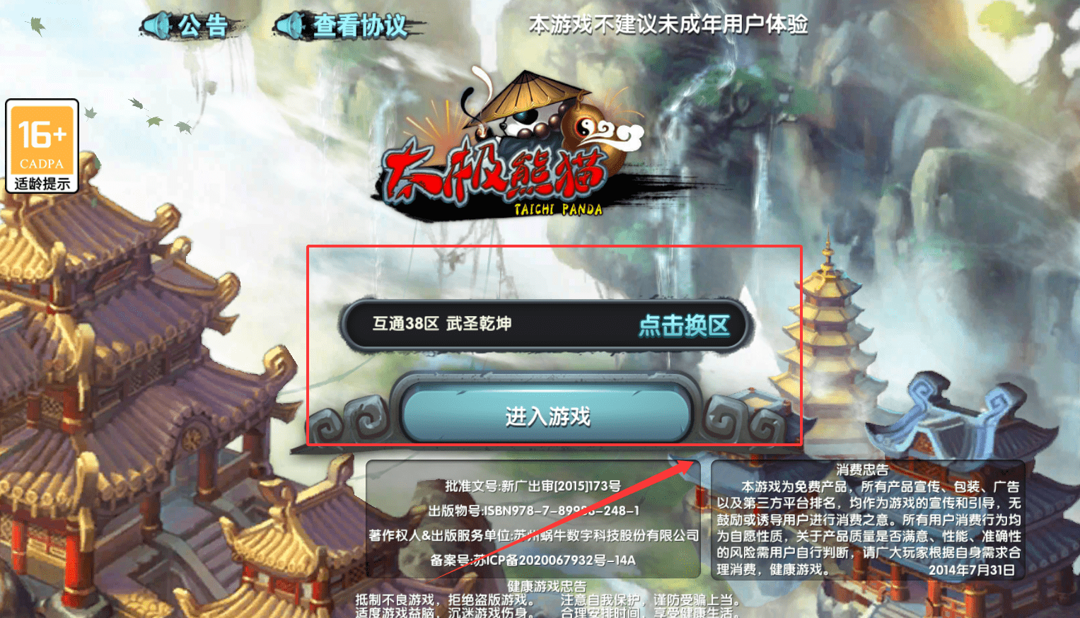 1、首先,在登录界面看到公告和适龄提示后,仔细阅读协议,然后点击“进入游戏”即可开始。记得根据自身情况合理消费哦。