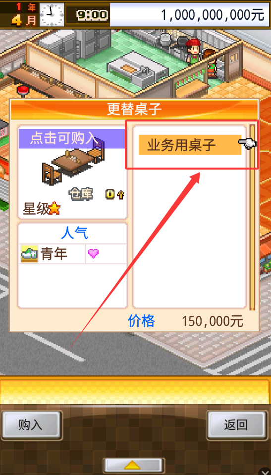 4、店铺升级方面,例如想更换家具,可以找到更替桌子的功能。在点击可购的列表中,选择如业务用桌子这样的物品。