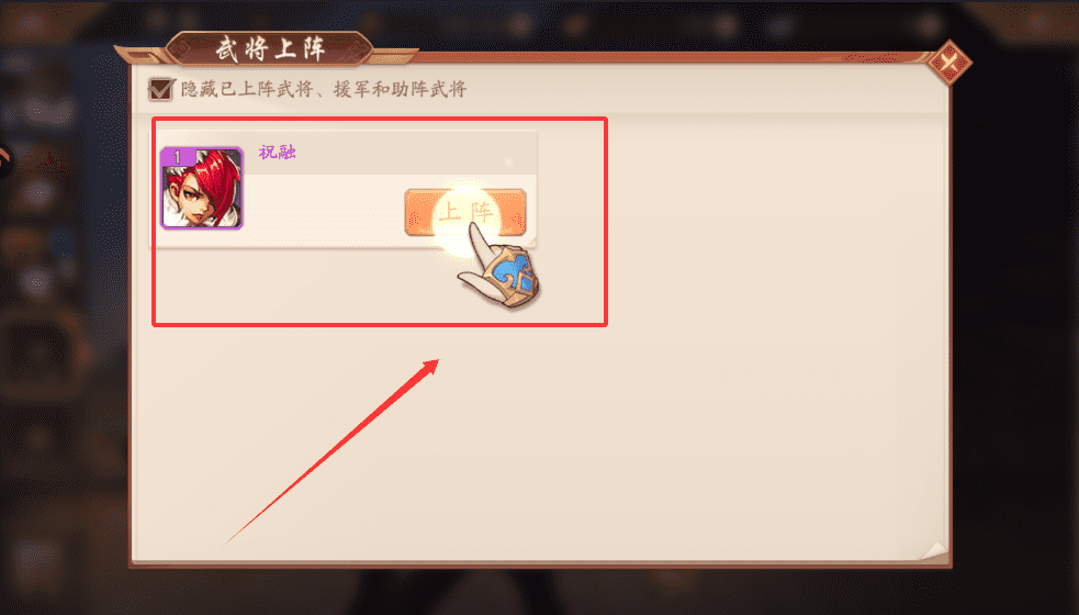 4、你可以勾选“隐藏已上阵武将”来方便查看,将培养好的武将拖入上阵位置,合理的阵容搭配能让你在征战和主线关卡中更轻松。