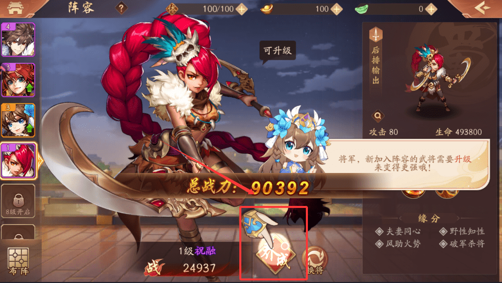 1、像“祝融”这样的武将,如果显示“可升级”,就说明她需要培养来提升战斗力了,你可以在这里选择想要上阵或培养的武将。