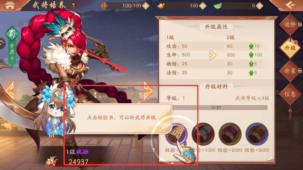 2、升级需要消耗经验书,点击“金+1000经验”这类材料就能增加经验,每次升级都能提升攻击、生命等属性。