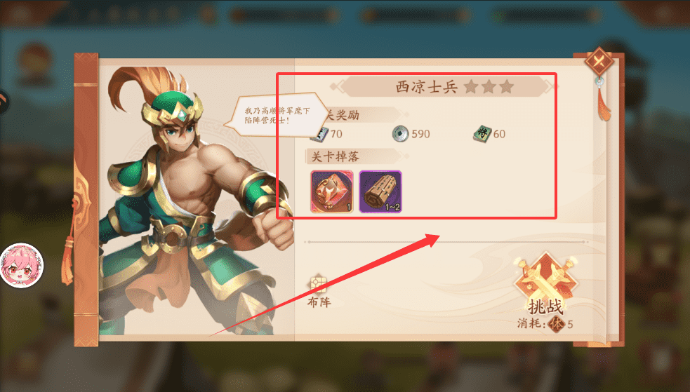 1、可以在布阵界面调整你的队伍阵容,合理搭配武将,准备应对西凉士兵和重骑。点击“挑战”即可开始,每次会消耗5点体力哦。