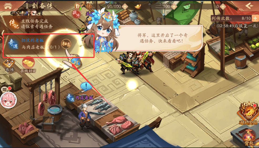 1、建议你去探索奇遇任务,比如这里的“担忧的老板”,你需要找到肉店老板对话,这个就是关键步骤了。