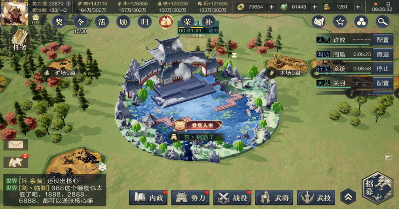铜币、木材、铁矿、石料等资源多由不同等级地块产出,主公需要根据战力占领尽多的地块生产资源。