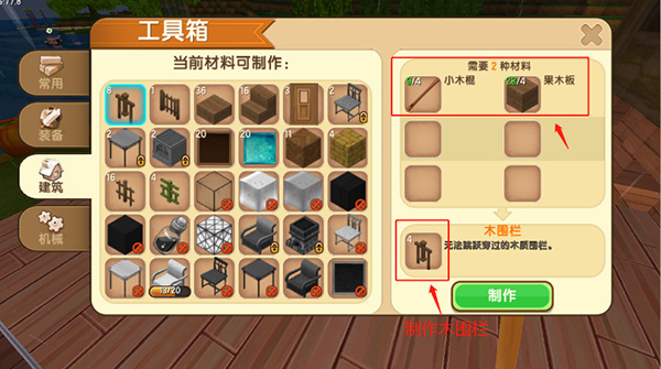 首先使用木头合成一个工具箱,制作木质楼梯。