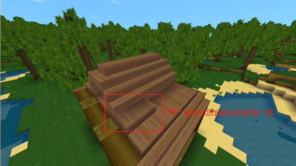 沿着小尖楼顶的边缘,使用木质台阶向外延伸一格,为了保持对称性,左右两边都需要哦。