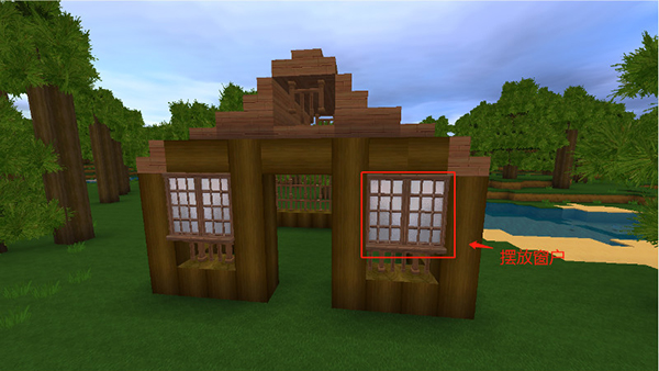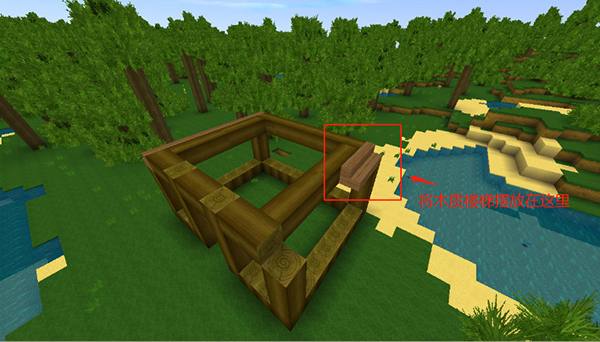 接着把做好的木质楼梯,摆放在房子框架的空格处,作为房子的屋檐――注意方向不要摆错了。