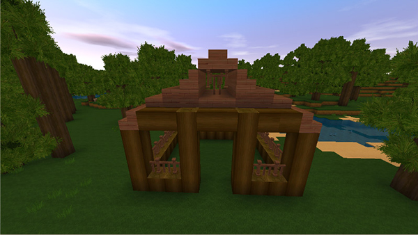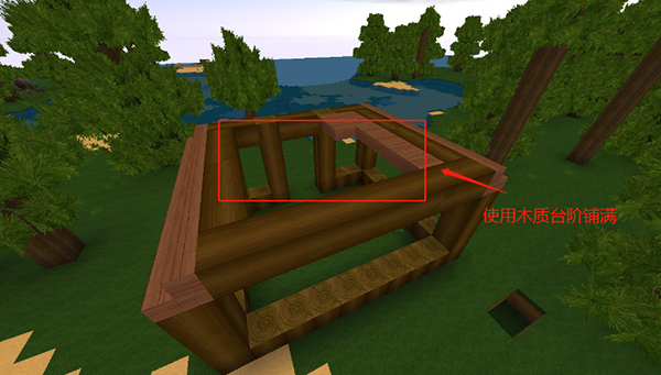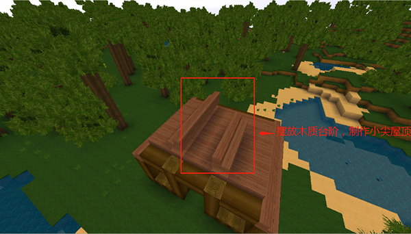 找到屋顶的中心位置,放置木质楼梯,做成一个小尖屋顶的形状。