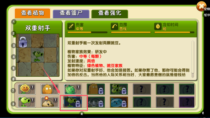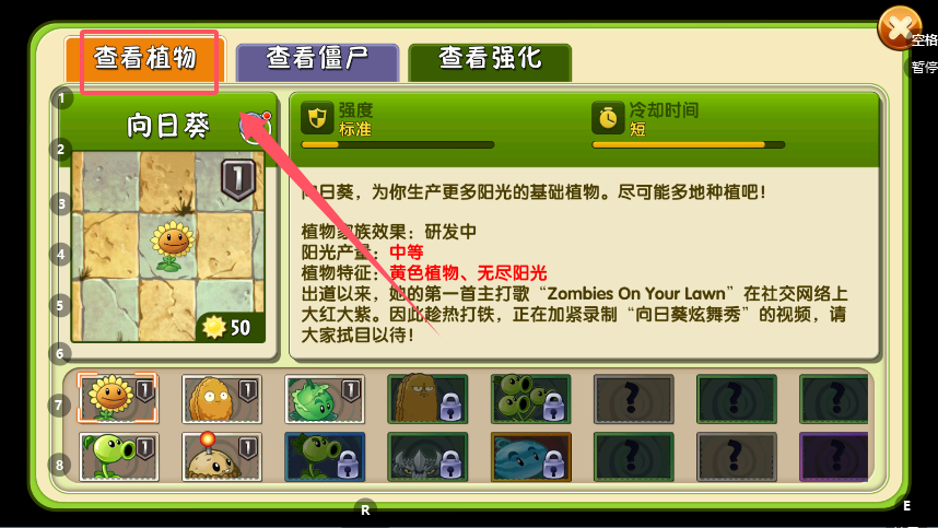 打开图鉴,可以看到植物与僵尸的详细介绍。