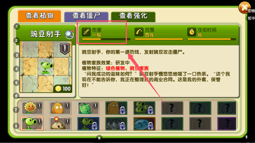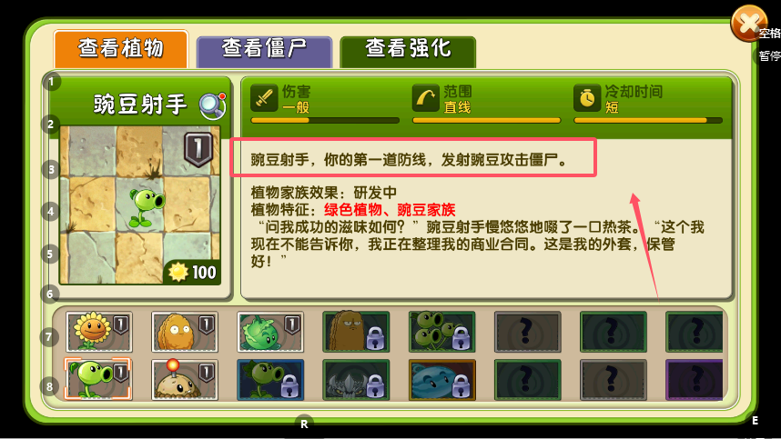 3、在属性面板下方,通常有一段生动的文字描述,以轻松幽默的口吻介绍植物的背景故事、性格特点与功能设定,例如豌豆射手的“商业合同”趣谈。