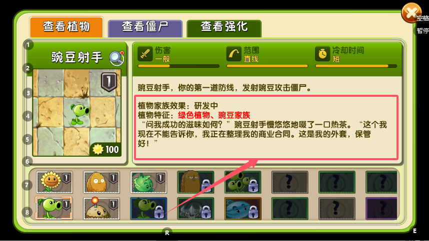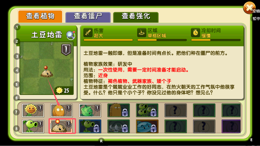 3、属性说明下方附有该植物的功能简介与背景故事,文字风格往往诙谐有趣,不仅说明了其在战斗中的具体用法(如“一次性使用,需要准备时间”),还赋予了植物独特的个性色彩。