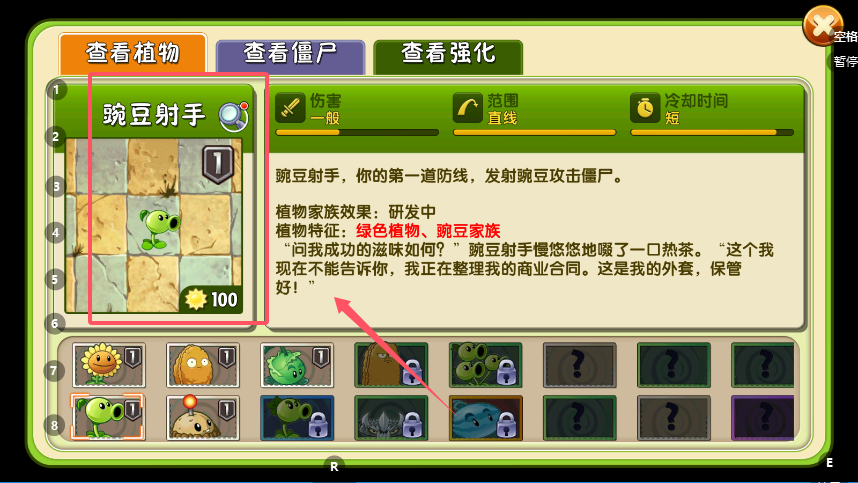 1、在游戏主界面找到功能分类,点击“查看植物”标签即可切换至植物图鉴模块,此时界面核心区域会重点展示一种植物,例如豌豆射手的全身画像,其形象生动且色彩鲜明。