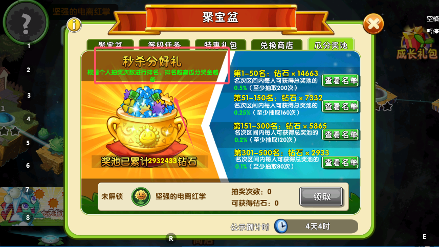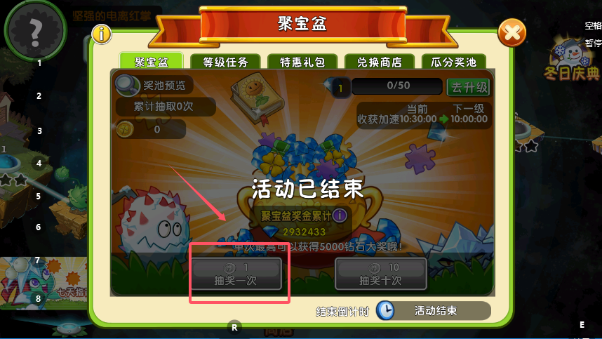 1、在植物大战僵尸2的游戏世界里,定位并进入“天宫寻宝”活动页面,页面布局分明,上方是“天宫寻宝”、“累计抽取”等选项卡,下方核心区域则是抽取记录与相关规则的具体说明。