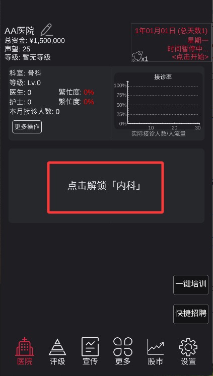3、随着游戏进程推进,当满足特定条件时即可点击解锁内科部门。解锁后你将能够使用该科室对应的诊断或治疗功能。