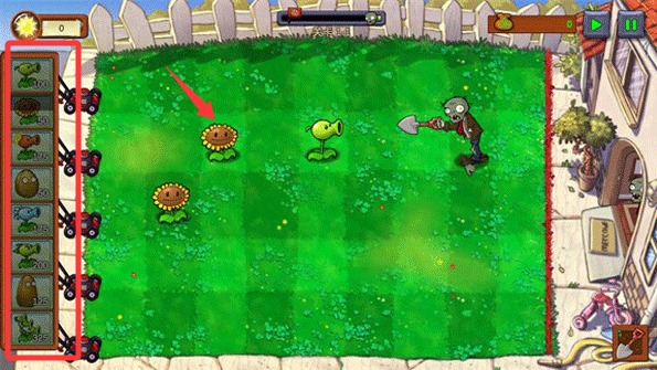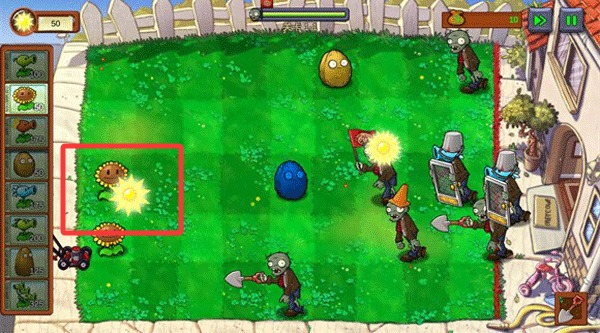 2、选择好之后可以开始安放植物了,在这里建议多放一些向日葵,不过在植物大战僵尸重生当中一个阳光的数值是50!这也减少游戏的难度!