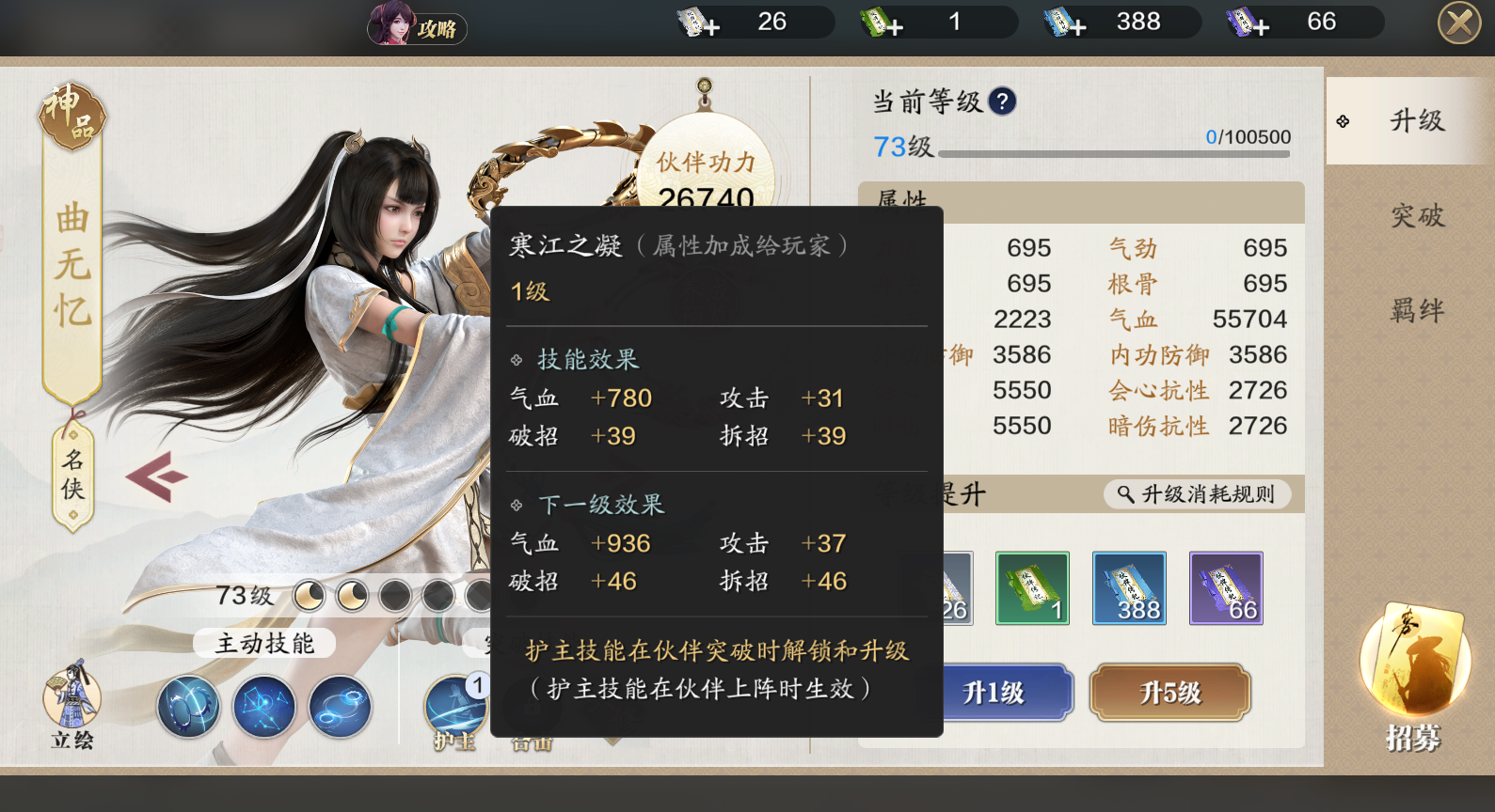 2、第一位四盟伙伴兑换曲无忆,2星曲无忆的护主技能同时加破招和拆招;