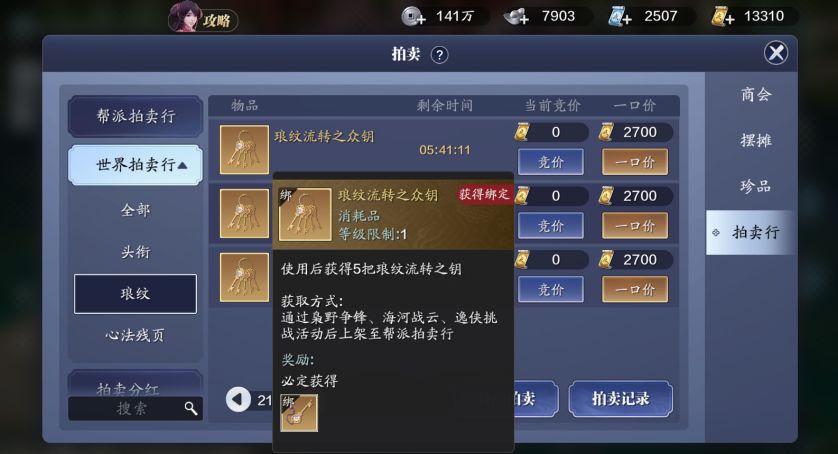 琅纹钥匙方面,在买完每周商城限购的绑点钥匙之后,也可以使用手中的点券去购买帮派拍卖的低价琅纹钥匙,但要注意留出足够多的点券为购买188点券的琅纹时使用。