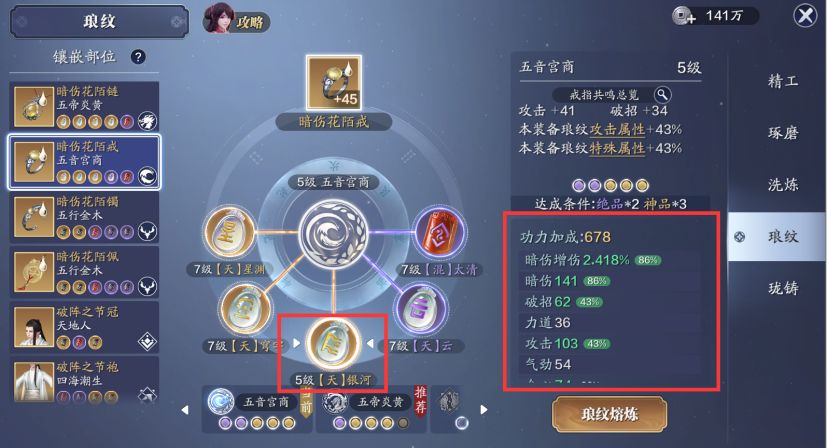 当全身2金共鸣达成后,再优先开始替换5孔部位的紫色琅纹,完成4金1紫共鸣后再替换4孔部位的琅纹。