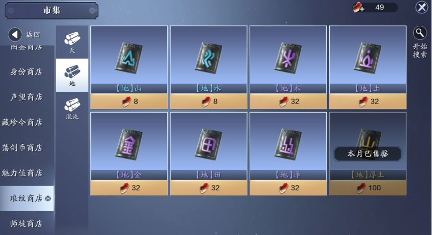 琅纹碎片则优先用于购买【地】厚土,其次用于购买【天】皇天,紫色混沌属性的琅纹如果暂时没有足够的碎片去兑换,可先用其余的【天】【地】类紫色琅纹做替换。