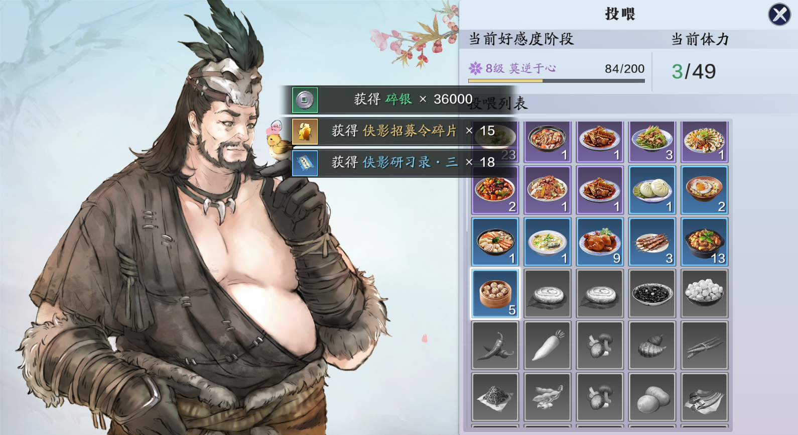 5、多余的绿色食物可送给郝厨子,给郝厨子送食物可获得蓝色伙伴经验书、碎银和侠影招募令碎片;