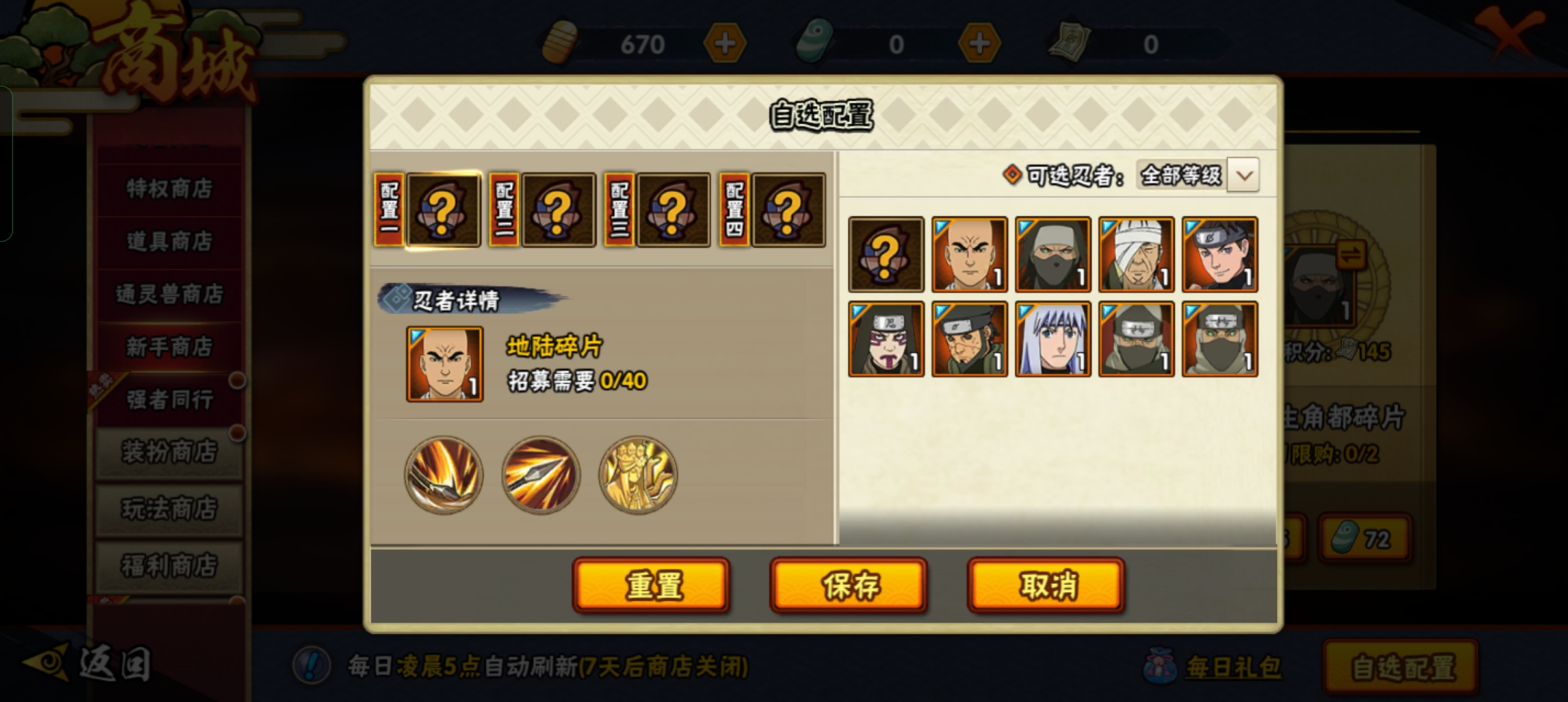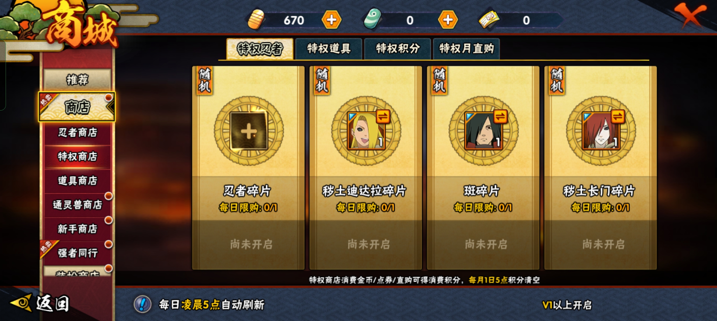 有能力的可以微氪6元解锁一下特权商店还会附带一个C忍小李和通灵兽守鹤,解锁特权商店可以购买一些老高招忍者的碎片,老高招的骨架,清水,秽土F4等,目前在决斗场中都是t0的存在。(千万别买神卡!!!)