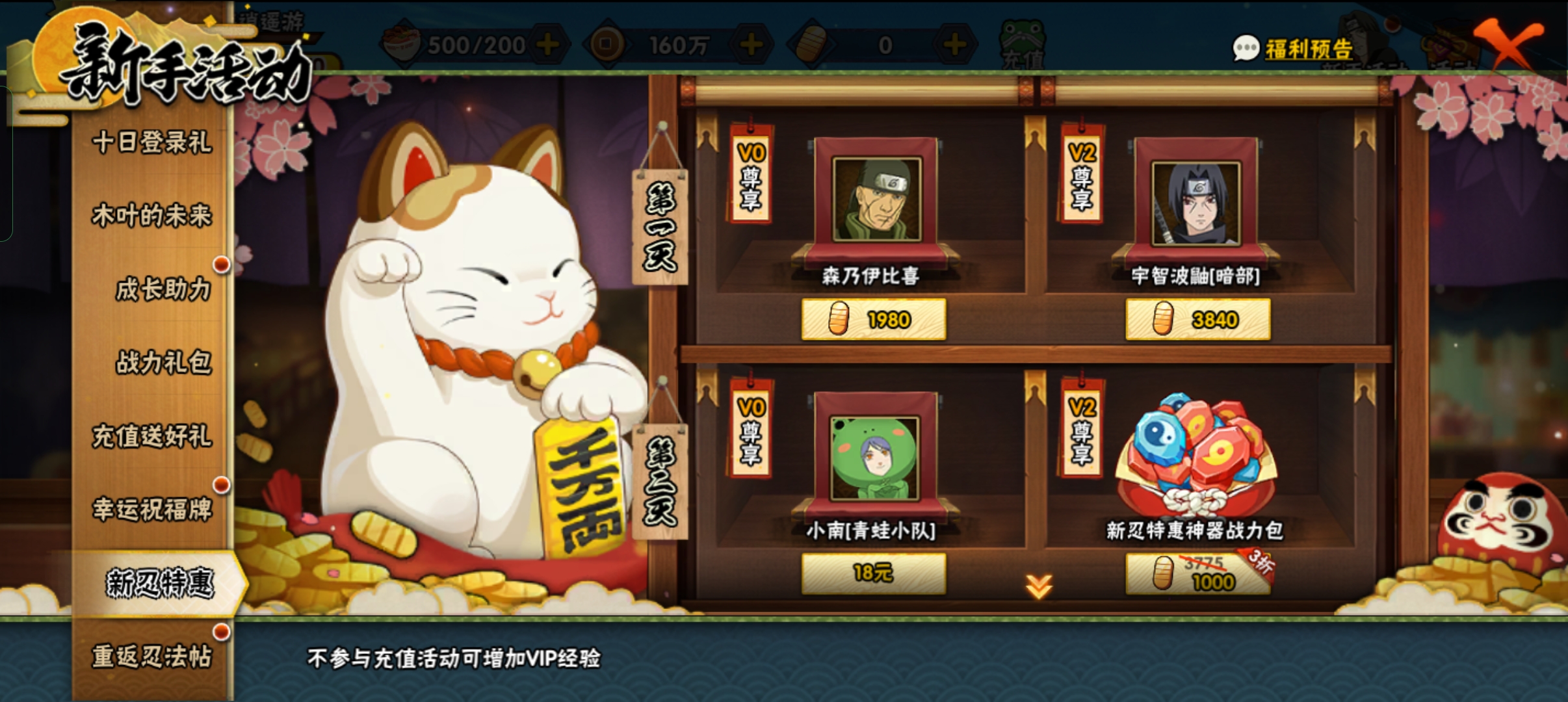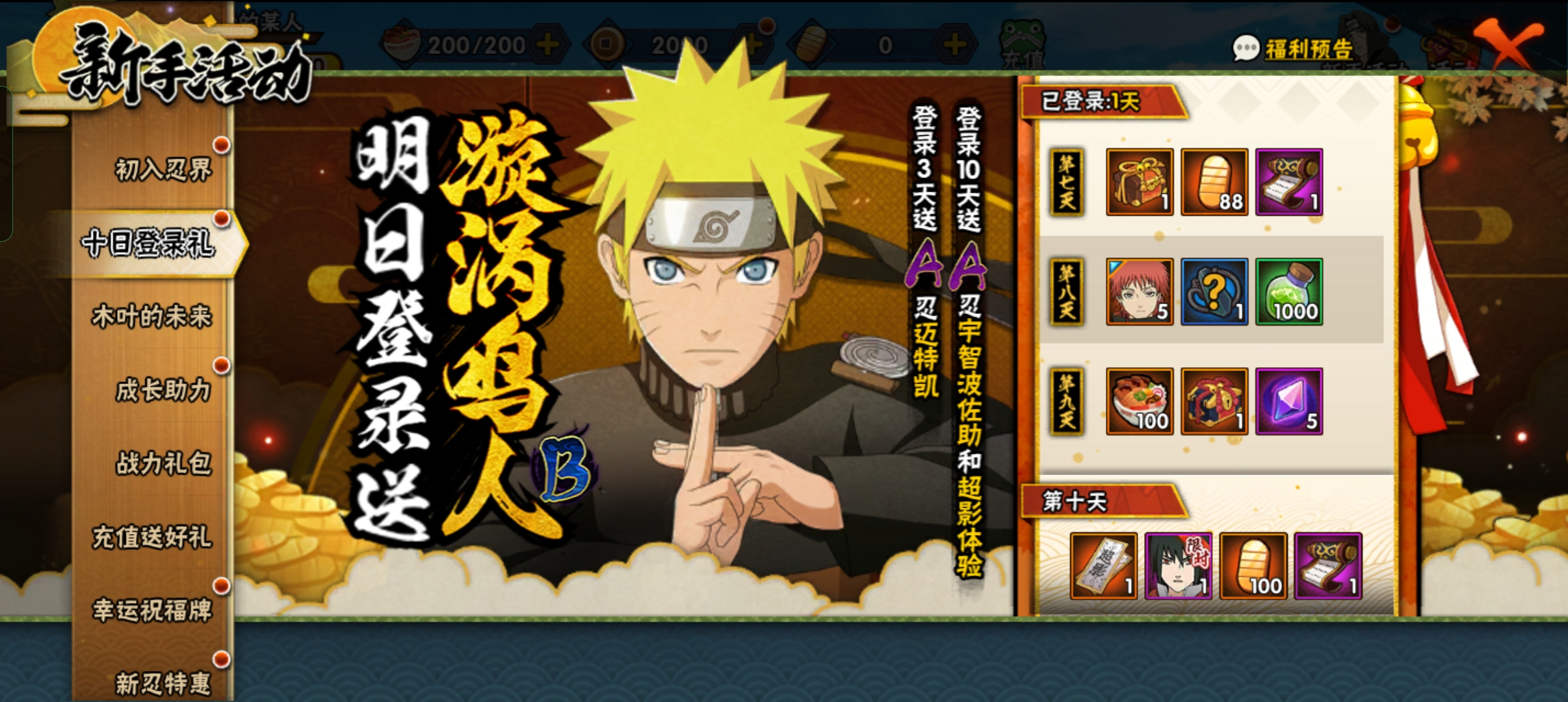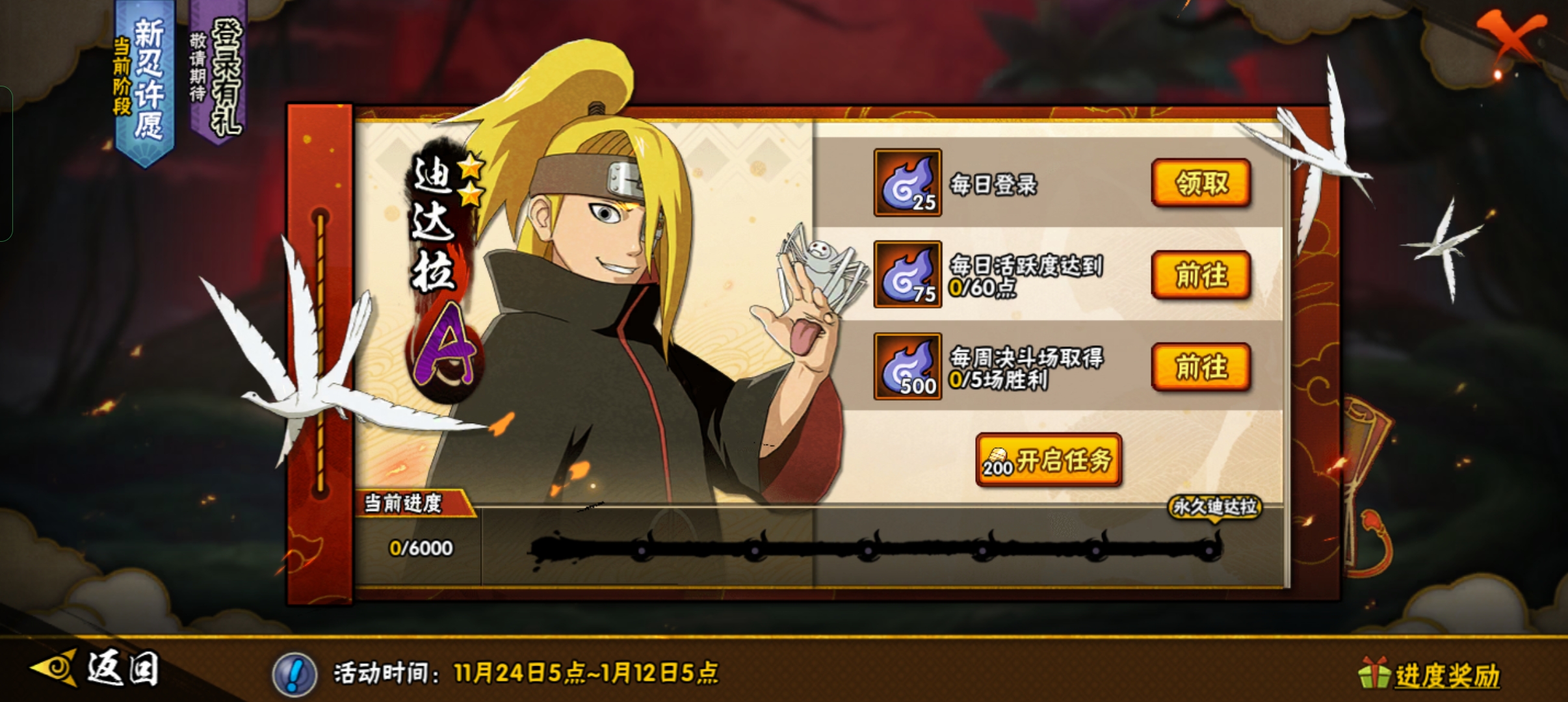 新手还有个新忍许愿的活动和登录有礼,一个月之内完成每日任务和每周任务可以直接获得迪达拉,迪达拉新手刷图还是挺快的。