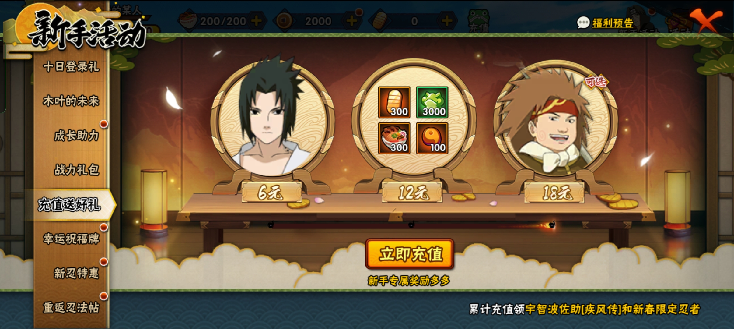 充值送好礼,微氪党可以购买,新春忍者一般只会在有活动的时候返场,忍者都是娱。