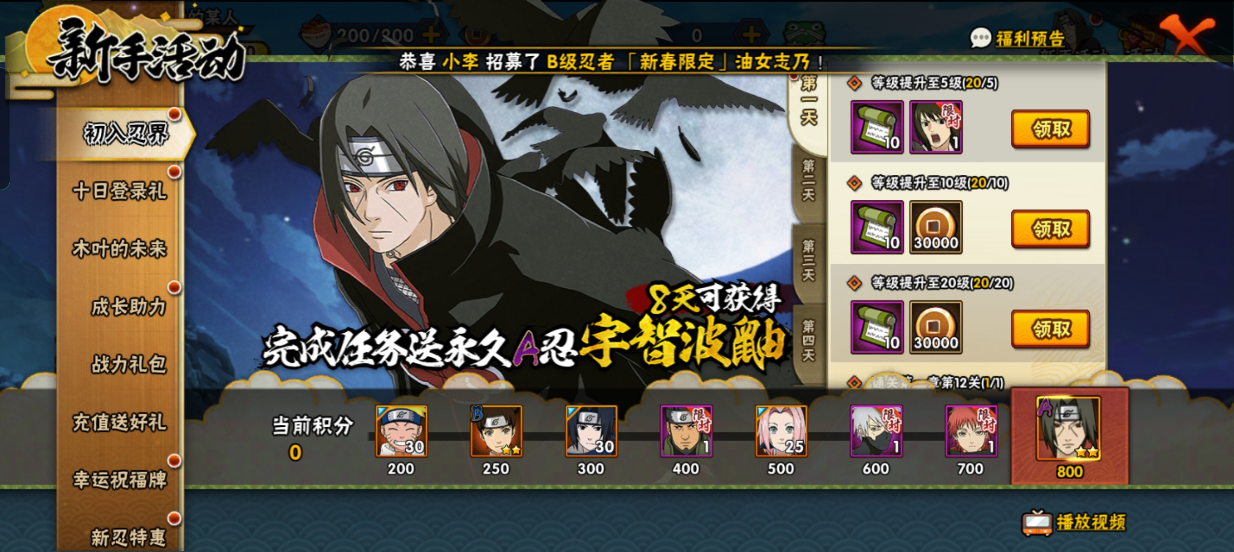 首先映入眼帘的就是新手活动啦,活动只要完成8天每天的任务就可以获得一些B忍啊,C忍的,新手活动送的B忍C忍可以通过精英副本就可以获得,没有太大的价值,新手活动有价值的就是第8天的宇智波鼬了,鼬在目前决斗场中作为新手还是可以用的,伤害高打输出快,就是技能cd有些长,有部分后摇,打副本刷图都挺好用的。