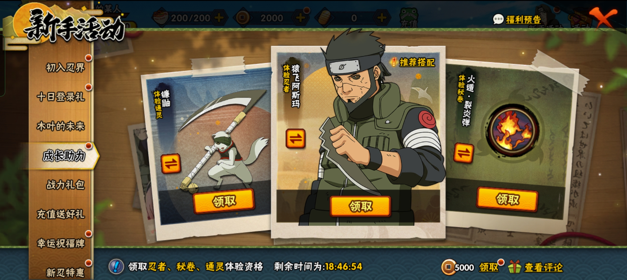 新手福利的成长助力,可以免费提供玩家部分忍者,通灵兽密卷进行体验,玩家也可以更换体验资格,在可以选择的忍者,密卷,通灵兽自定义搭配。