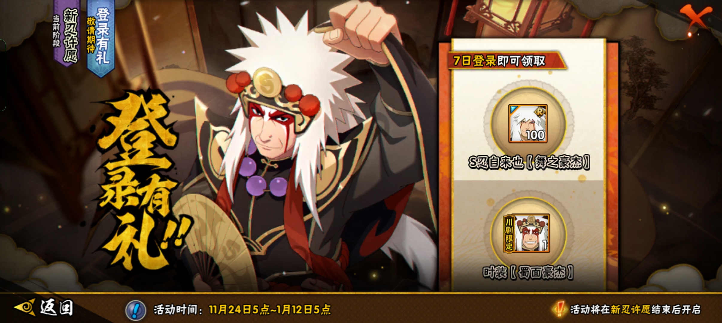 登录有礼会在完成新忍许愿的活动后解锁,登录7天就可以获得第一个S忍―自来也和自来也的皮肤。装备皮肤可以改变技能,自来也现在也还是挺强的,突进,防御,抓取位移应有尽有。