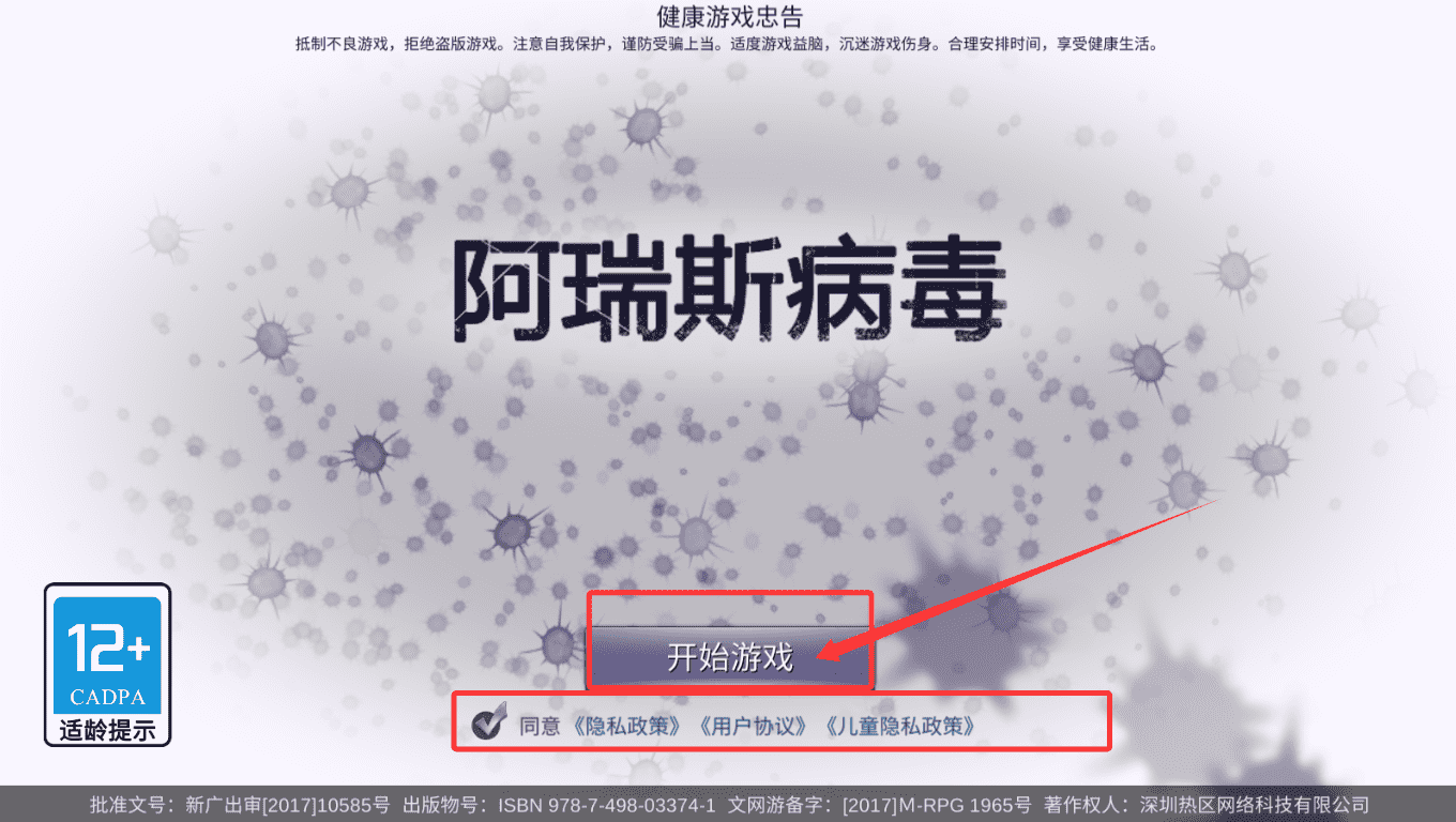 1、启动游戏后,在初始界面需留意健康游戏忠告与适龄提示,确认同意《隐私政策》等文件并点击“开始游戏”,便可进入主菜单。