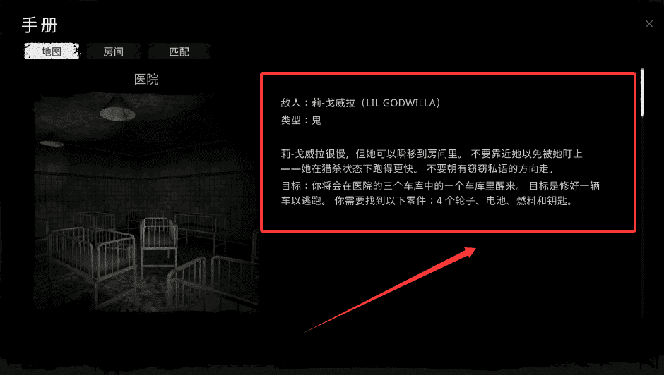 3、注意敌人莉-戈威拉是鬼类型,她移动较慢但会瞬移,避免靠近她,也不要朝有窃窃私语的方向走,以免触发她的猎杀状态。