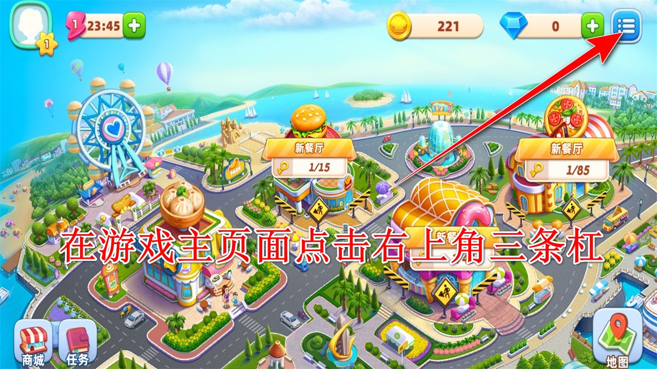 1.在游戏主页面点击右上角三条杠。