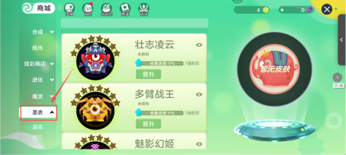 3、进入圣衣分类界面,查看 “壮志凌云” 等圣衣选项,点击 “晋升” 按钮可提升圣衣等级。