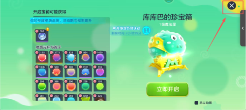 4、打开 “库库巴的珍宝箱” 界面,点击 “立即开启” 按钮,可开启宝箱获取对应的道具奖励。
