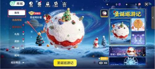 1、点击左侧的推荐玩法入口,进入以雪球为主体的圣诞主题场景,同时可查看界面底部黄色的 圣诞游记”按钮。